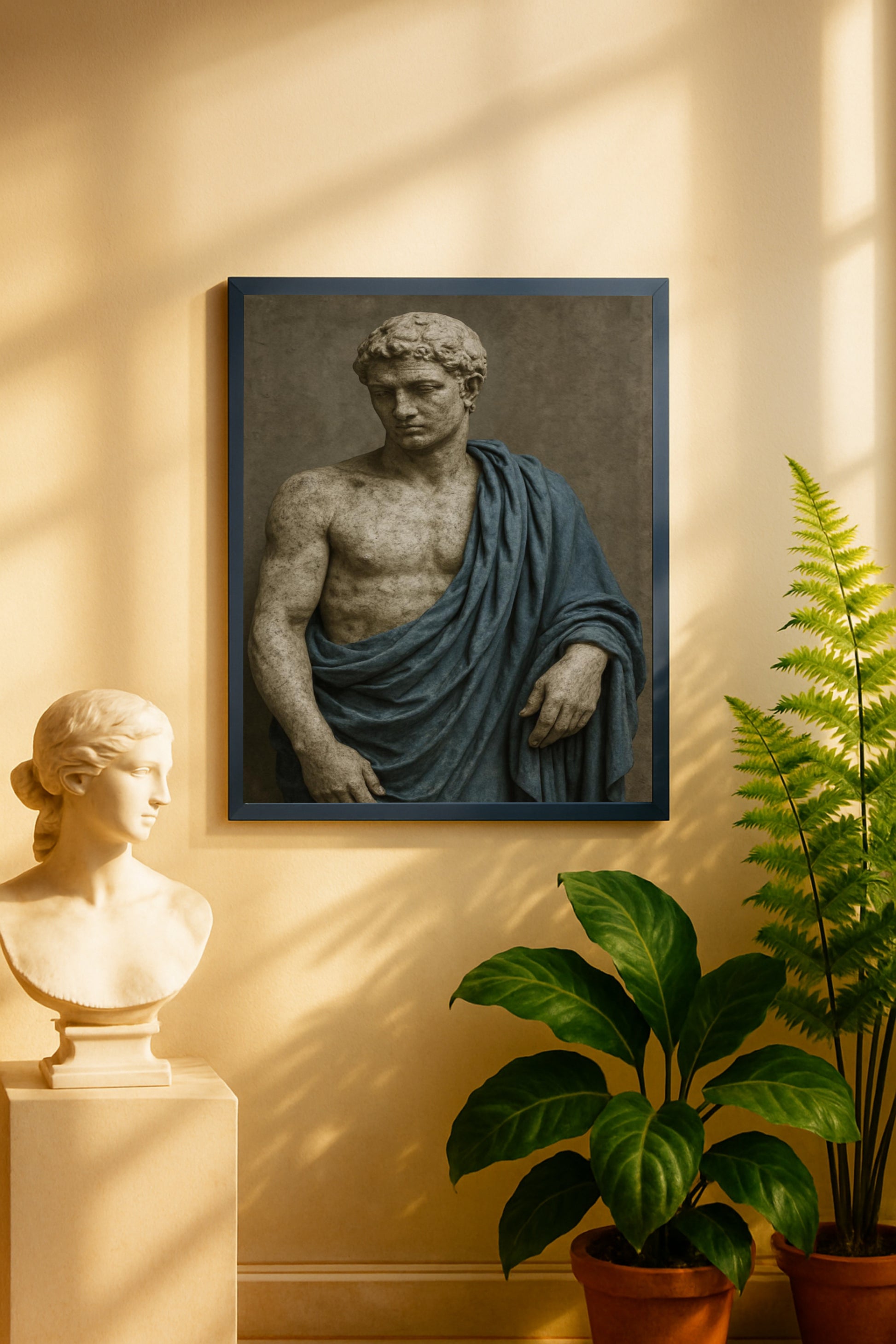 Add timeless elegance and sophistication to your space with this striking digital artwork. Featuring a detailed classical statue with a muted stone finish, draped in a rich blue cloth, this piece blends history, artistry, and modern style. Perfect for living rooms, offices, studies, or gallery-inspired interiors, this printable wall art makes a bold and cultured statement in any room.